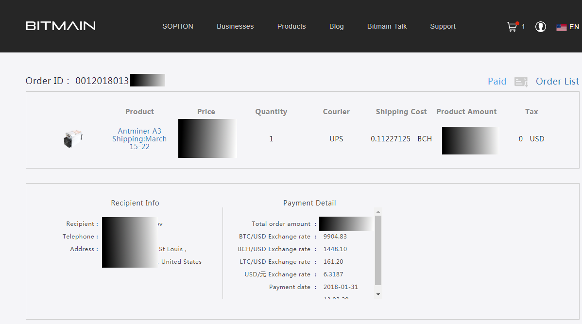 Bitmain shipping: around March 15-22. Shipping to customer: as soon as we have it in hand, most likely delivered to the customer at the end of March or in the early April.